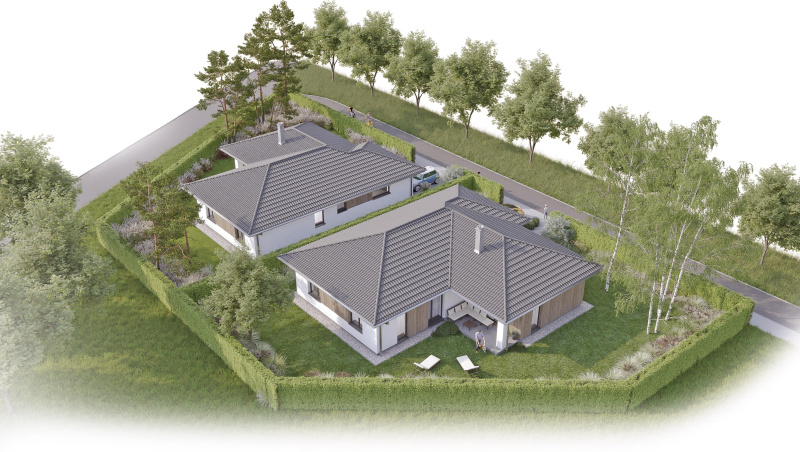 Oba rodinné domy sú moderné samostatne stojace jednopodlažné bungalovy s valbovou strechou.